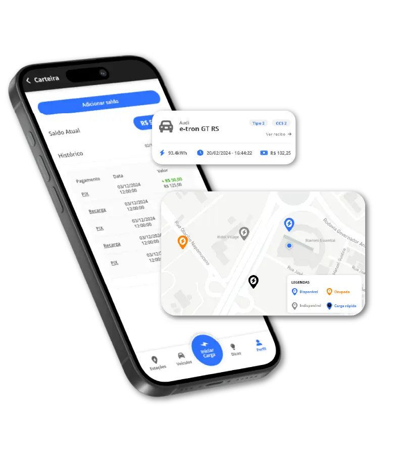 Acompanhe o status da recarga em tempo real diretamente no aplicativo. Saiba exatamente quanto já foi carregado e o tempo restante para completar sua sessão.